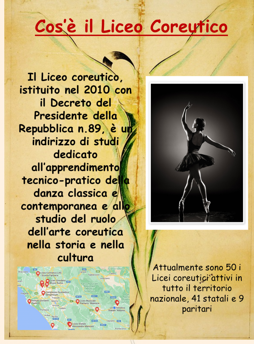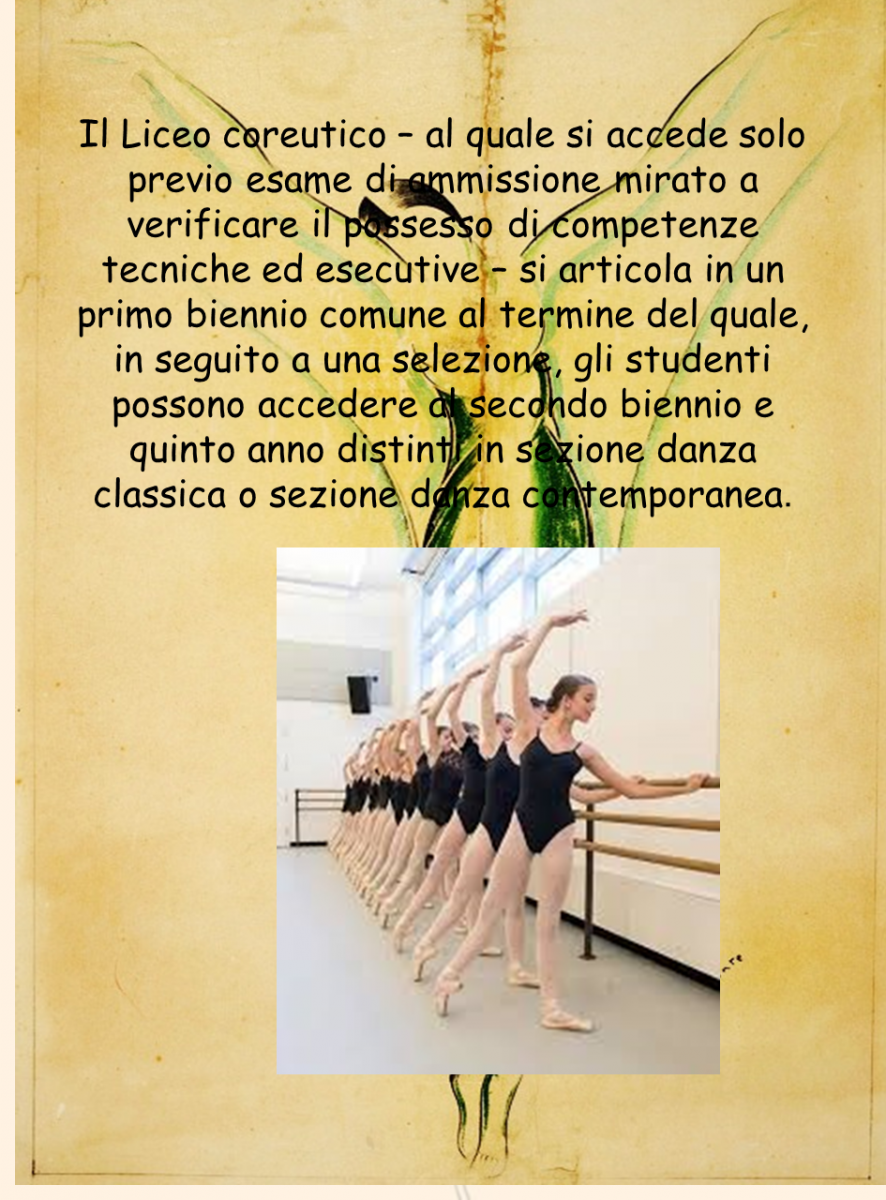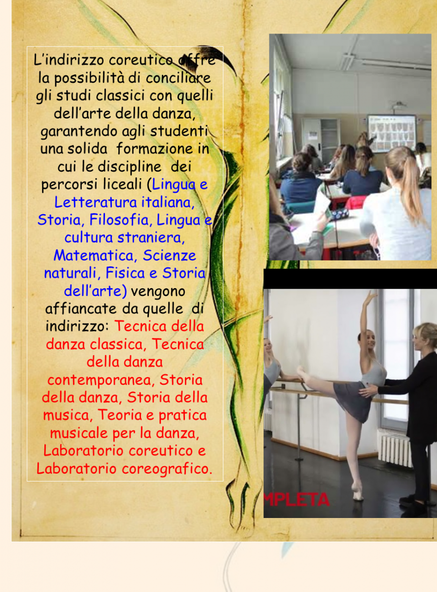 Il Liceo coreutico garantisce un ampio ventaglio di conoscenze e permette di acquisire una buona cultura generale, prevalentemente umanistica, oltre alla possibilità di affinare le proprie abilità nella danza. Le discipline coreutiche di indirizzo sono affrontate non solo a livello teorico, ma soprattutto a livello pratico.