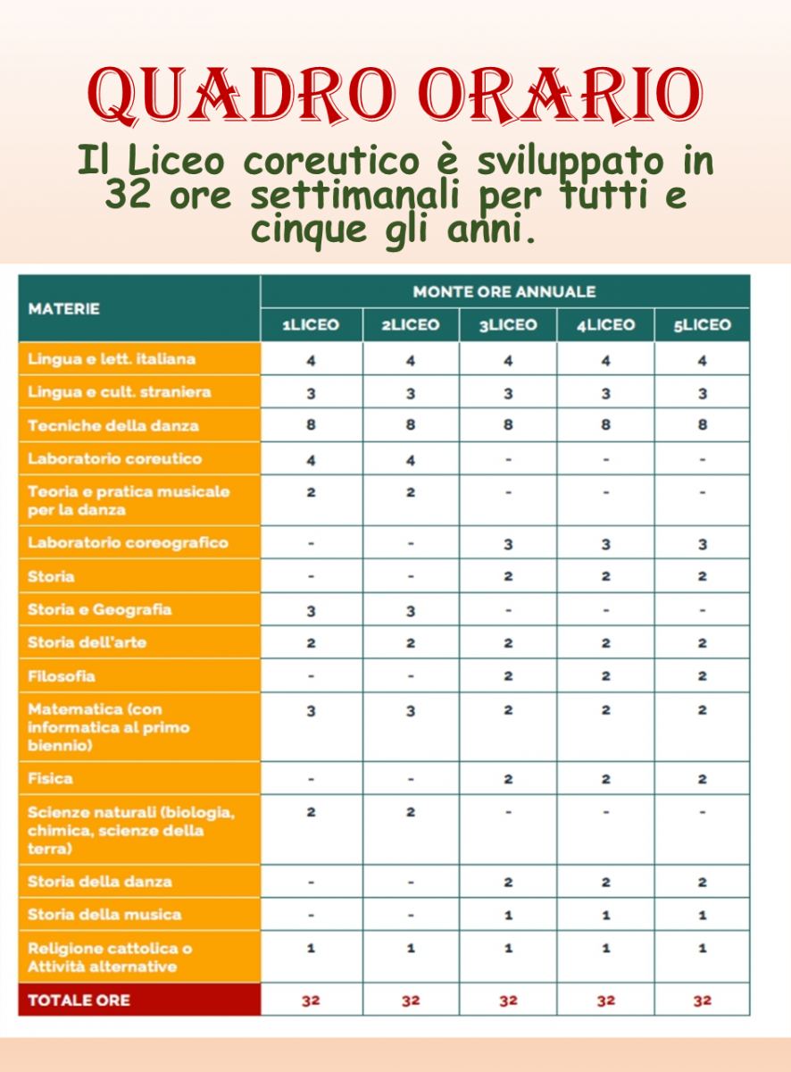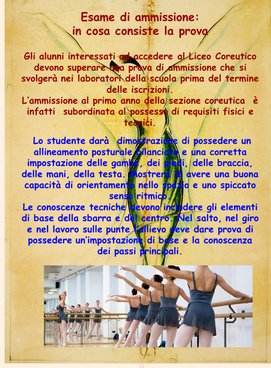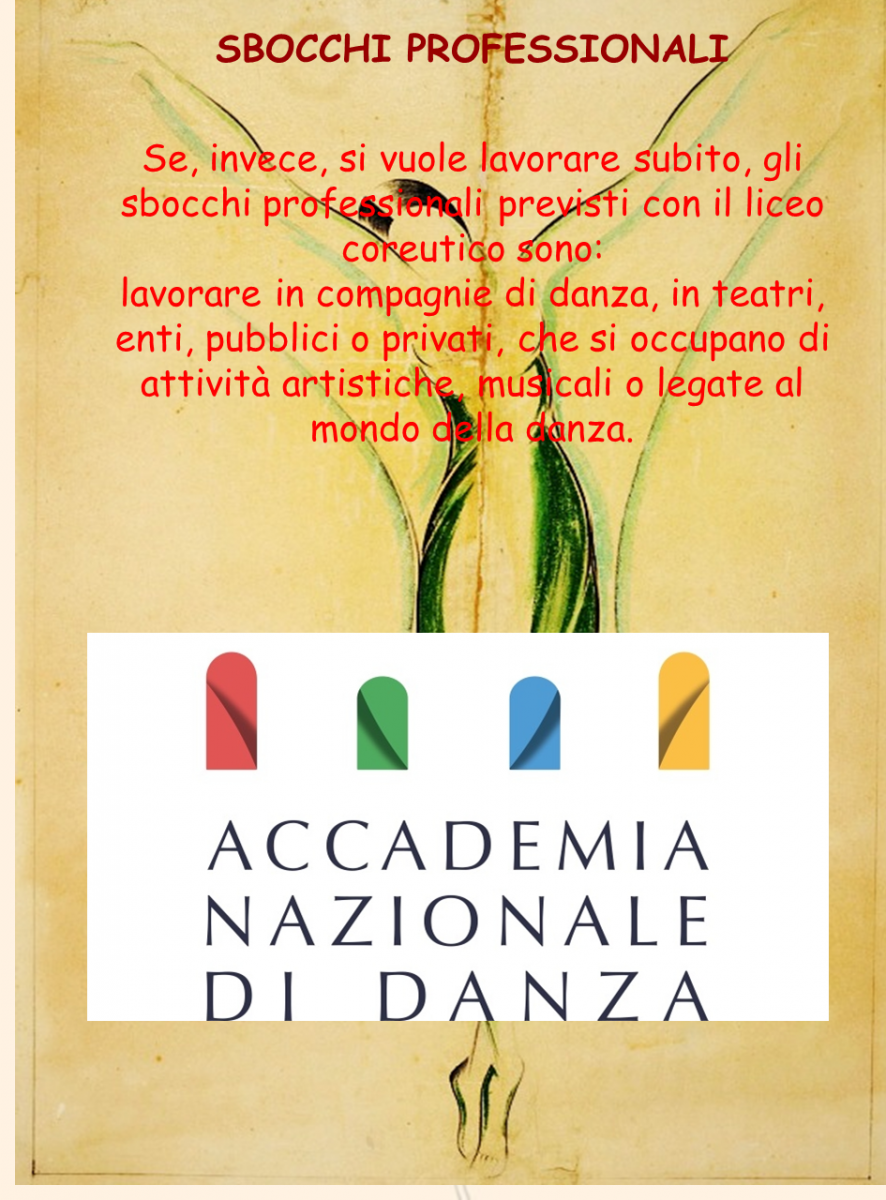 Il Liceo coreutico garantisce un ampio ventaglio di conoscenze e permette di acquisire una buona cultura generale, prevalentemente umanistica, oltre alla possibilità di affinare le proprie abilità nella danza. Le discipline coreutiche di indirizzo sono affrontate non solo a livello teorico, ma soprattutto a livello pratico.